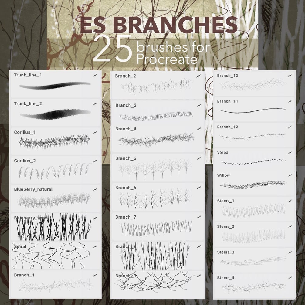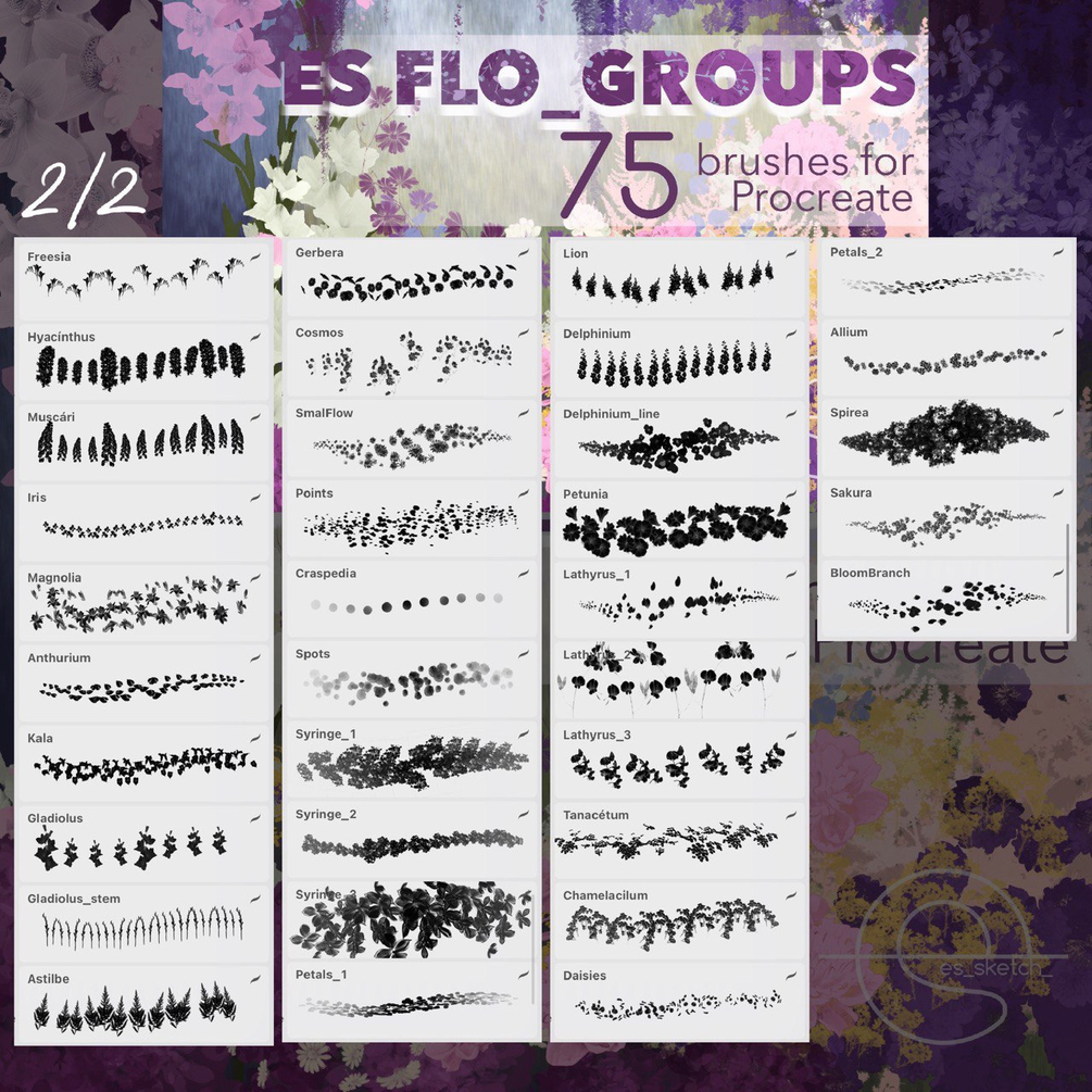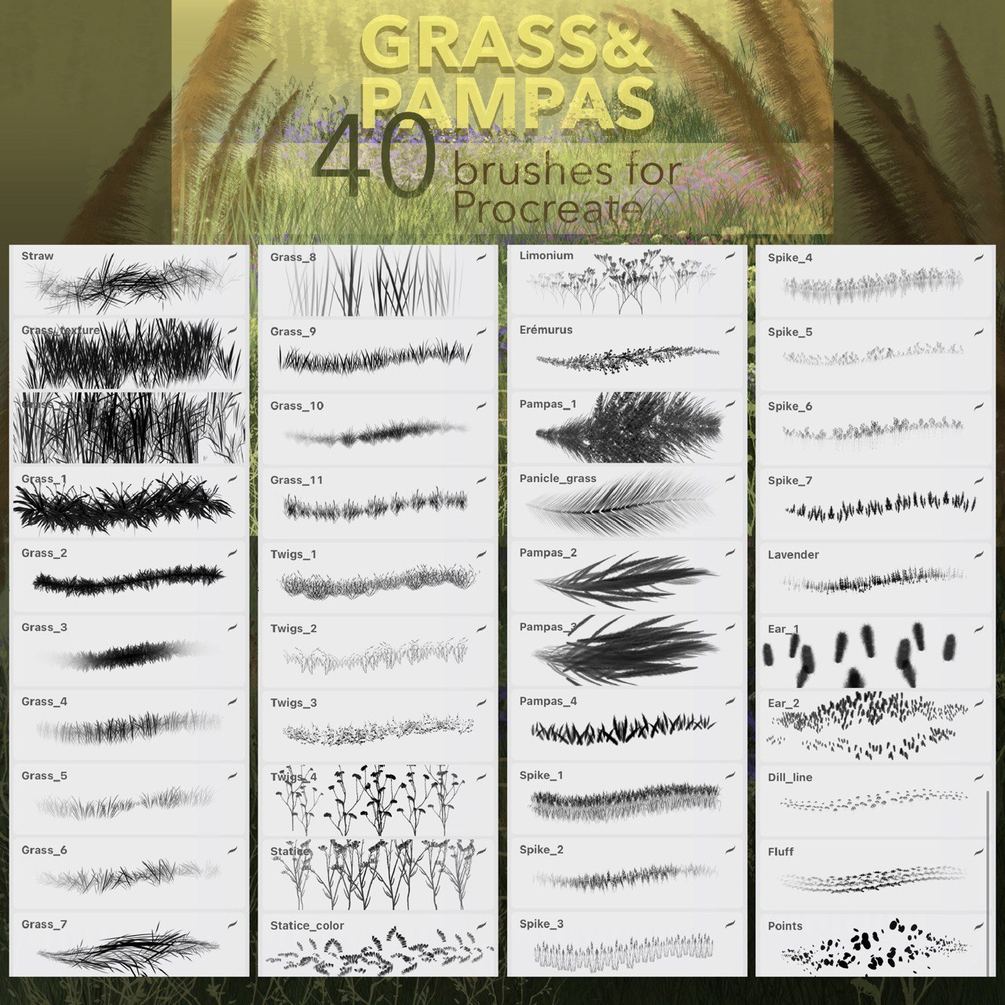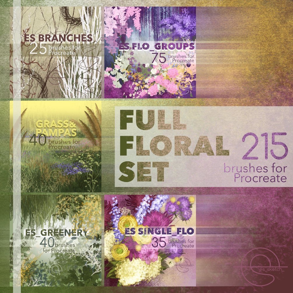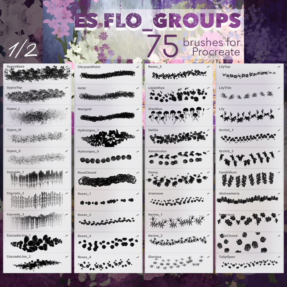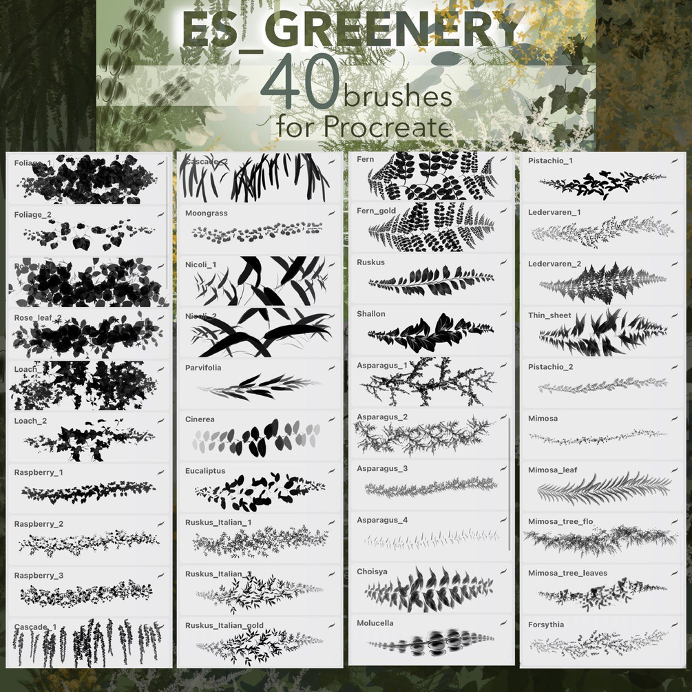 Over 215 brushes for painting flowers, greenery, grass and brunches in the Procreate app.